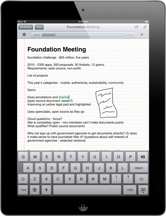 When you're done, share your text, drawings, and audio notes via email, or transfer them directly to your Mac or PC. Audio notes are recorded in standard M4A format: One hour of high quality audio is only 20MB.