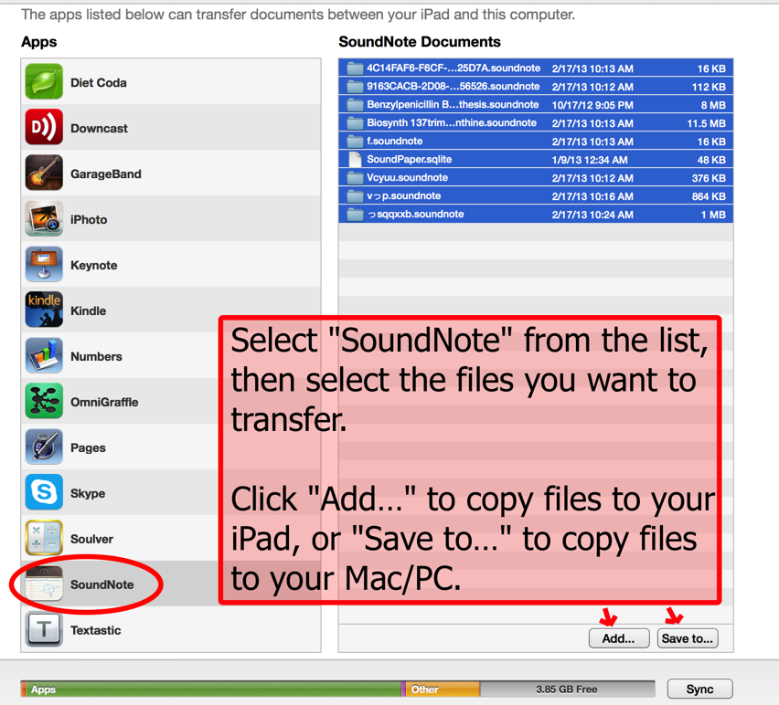 Open the "Apps" tab, scroll down to File Sharing, and choose SoundNote from the list. You can save your SoundNote files from here. Follow the same procedure to load them back into your iPad later. Note, if you're using Windows, you may have to zip the .soundnote files before iTunes will accept them.